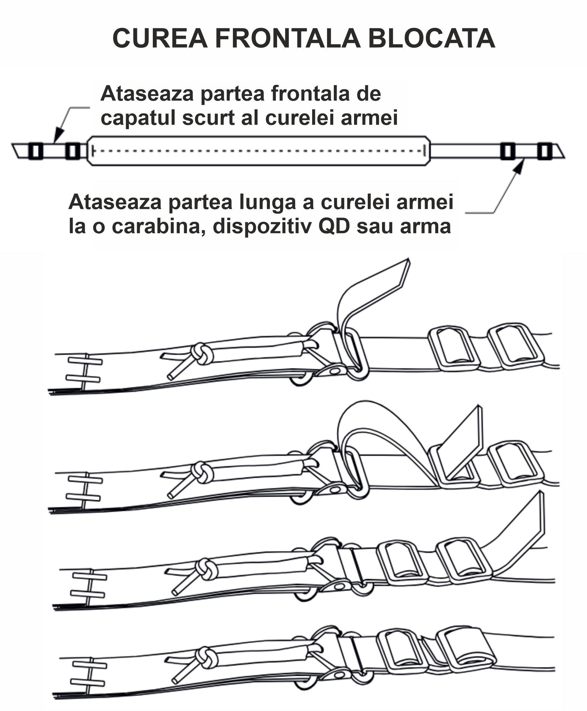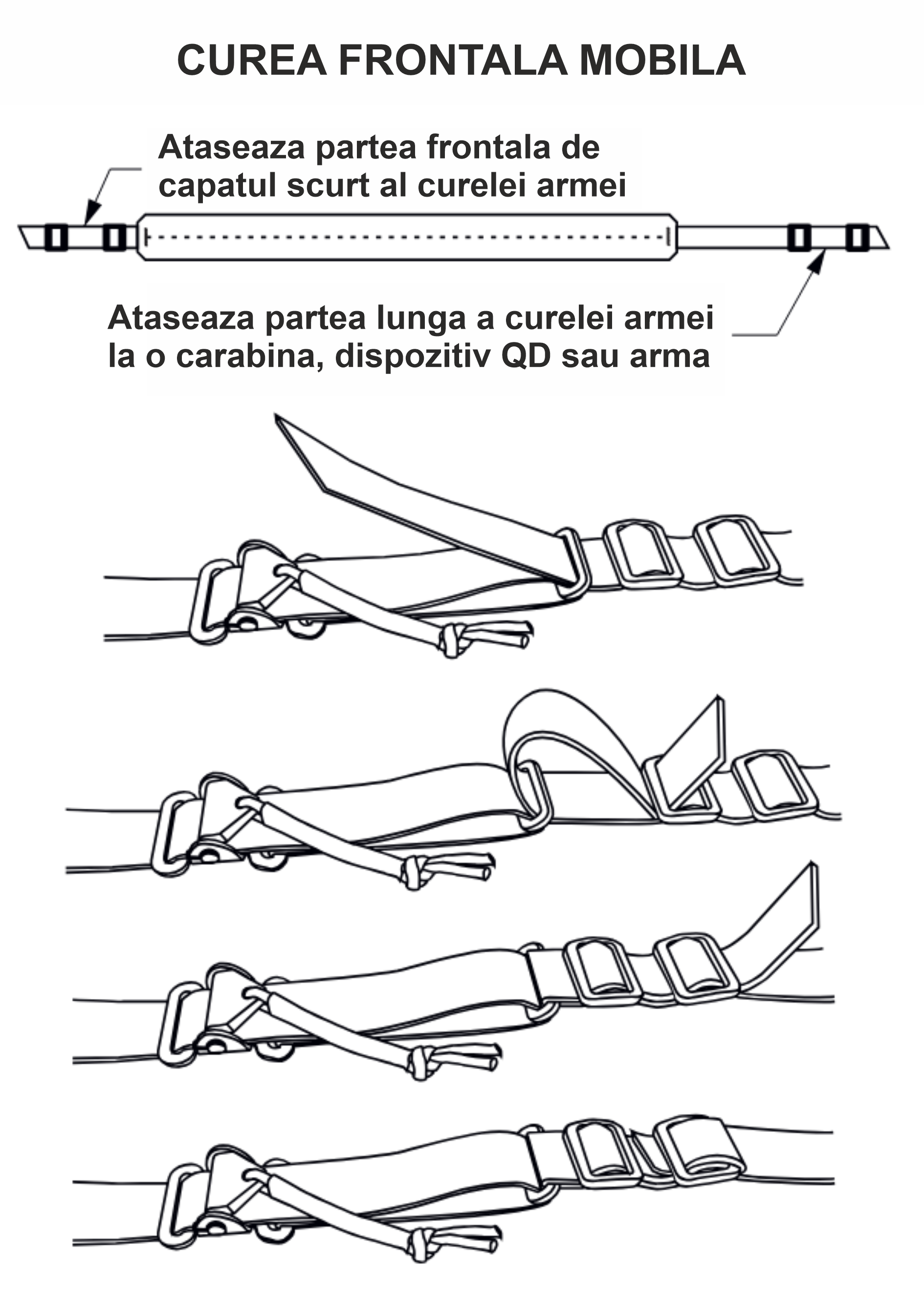 In imaginile de mai jos gasesti pasii ce trebuiesc facuti pentru a atasa cureaua frontala la cureaua armei.